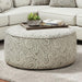 POCKLINGTON Ottoman, 39"L X 39"W X 18"H, 32lbs. It is broad, round, firm and soft. This ottoman is perfect for use in any room and the artful tones of vintage paisley patterns ensure a nice visual dynamic. The buoyant and comfortable surface is a favorite for casual sitting or leg-resting, and is easily portable to meet the demands of the entire family!