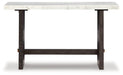 Dressed to thrill, this simply stunning sofa table offers a high-design look at a down-to-earth price. Ultra-sleek lines are accentuated with a dark waxy brown oak finish that’s so easy on the eyes. Clean-lined and modern, the plinth base and natural marble tabletop showcase quality craftsmanship and attention to detail. This table is the perfect sofa companion for a living room or family space, with a timeless look that's made to last.
