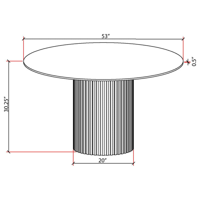 Bring polished sophistication and lasting durability to your kitchen or dining room with a modern dining table. It's crafted from sintered stone, a synthetic surface crafted from minerals exposed to heat to create an authentic look for white marble. Subtle grey veins add depth and detail to the table top. Underneath, a white finished pedestal features a round silhouette and vertical reeded details that add contrasting texture to the smooth table top. This striking dining table is an elegant choice, offering fresh, clean ambiance to your breakfast nook or dining room.